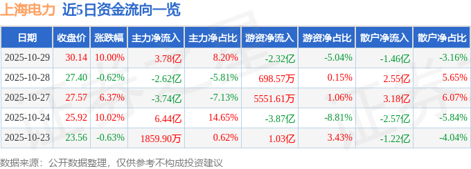 证券之星消息,截至2025年10月29日收盘,上海电力(600021)报收于30.14元,上涨10.0%,涨停,换手率5.54%,成交量156.22万手,成交额46.14亿元。