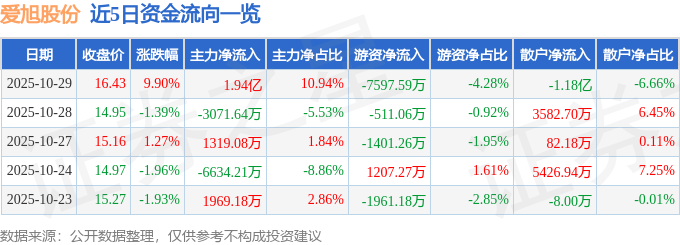10月29日的资金流向数据方面,主力资金净流入1.94亿元,占总成交额10.94%,游资资金净流出7597.59万元,占总成交额4.28%,散户资金净流出1.18亿元,占总成交额6.66%。