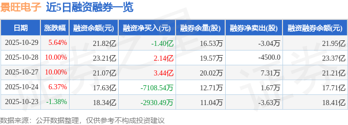 景旺电子融资融券信息显示,融资方面,当日融资买入5.42亿元,融资偿还6.81亿元,融资净偿还1.4亿元。融券方面,融券卖出6400.0股,融券偿还3.68万股,融券余量16.53万股,融券余额1347.86万元。融资融券余额21.95亿元。