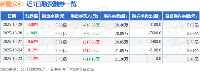 新疆众和融资融券信息显示,融资方面,当日融资买入5009.42万元,融资偿还5428.03万元,融资净偿还418.6万元。融券方面,融券卖出1.03万股,融券偿还7200.0股,融券余量20.4万股,融券余额169.93万元。融资融券余额5.62亿元。