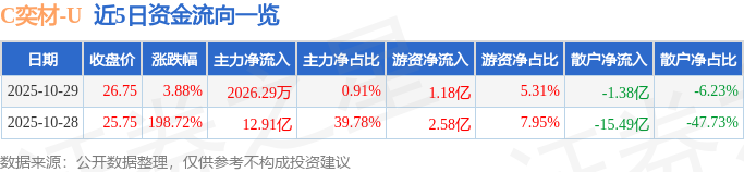 10月29日的资金流向数据方面,主力资金净流入2026.29万元,占总成交额0.91%,游资资金净流入1.18亿元,占总成交额5.31%,散户资金净流出1.38亿元,占总成交额6.23%。