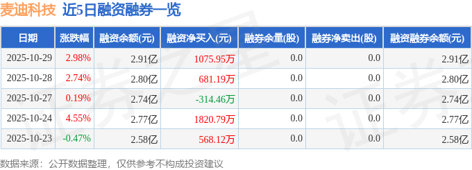 麦迪科技融资融券信息显示,融资方面,当日融资买入3947.09万元,融资偿还2871.14万元,融资净买入1075.95万元。融券方面,融券卖出0.0股,融券偿还0.0股,融券余量0.0股,融券余额0.0万元。融资融券余额2.91亿元。