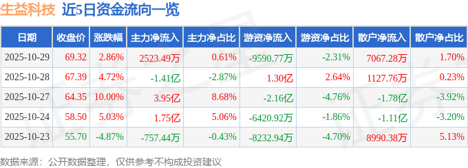 10月29日的资金流向数据方面,主力资金净流入2523.49万元,占总成交额0.61%,游资资金净流出9590.77万元,占总成交额2.31%,散户资金净流入7067.28万元,占总成交额1.7%。