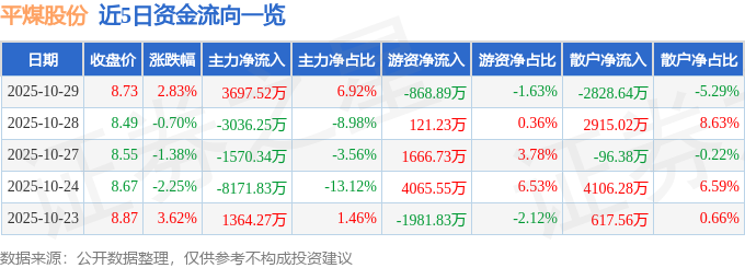 证券之星消息,截至2025年10月29日收盘,平煤股份(601666)报收于8.73元,上涨2.83%,换手率2.51%,成交量62.09万手,成交额5.35亿元。