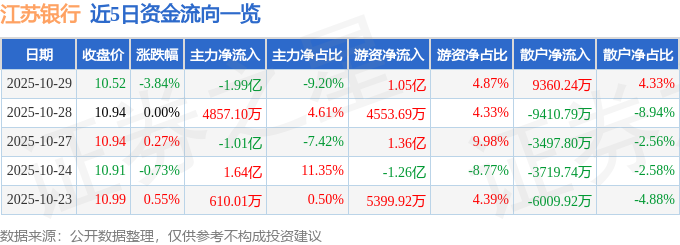 证券之星消息,截至2025年10月29日收盘,江苏银行(600919)报收于10.52元,下跌3.84%,换手率1.11%,成交量203.91万手,成交额21.64亿元。