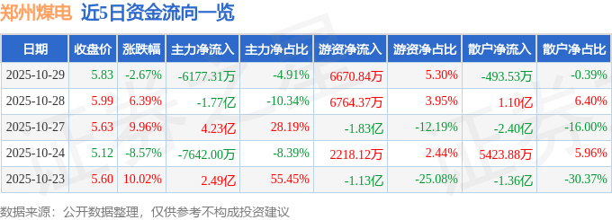 证券之星消息,截至2025年10月29日收盘,郑州煤电(600121)报收于5.83元,下跌2.67%,换手率17.8%,成交量216.92万手,成交额12.59亿元。