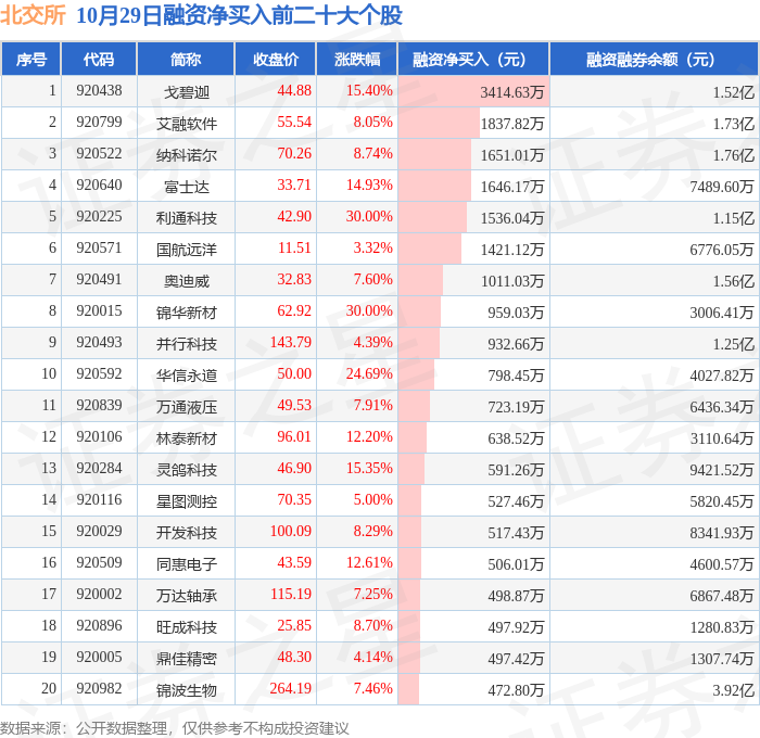 北交所融资净买入前三分别为:戈碧迦(920438)融资净买入3414.63万元、艾融软件(920799)融资净买入1837.82万元、纳科诺尔(920522)融资净买入1651.01万元,前20具体见下表: