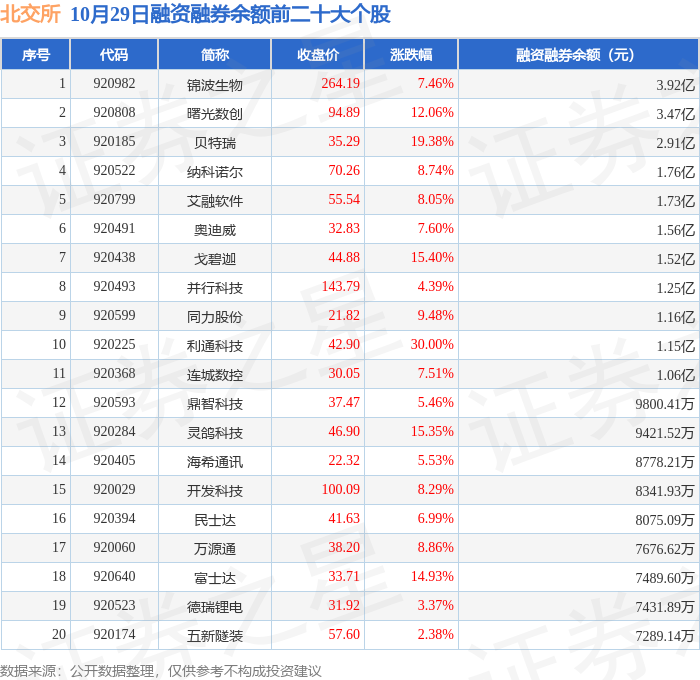 北交所融资融券余额前三分别为:锦波生物(920982)融资融券余额3.92亿元、曙光数创(920808)融资融券余额3.47亿元、贝特瑞(920185)融资融券余额2.91亿元,前20具体见下表: