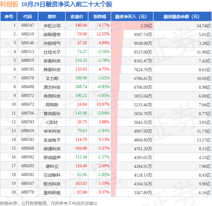 科创板融资净买入前三分别为:华虹公司(688347)融资净买入3.28亿元、统联精密(688210)融资净买入9587.74万元、中船特气(688146)融资净买入9038.98万元,前20具体见下表: