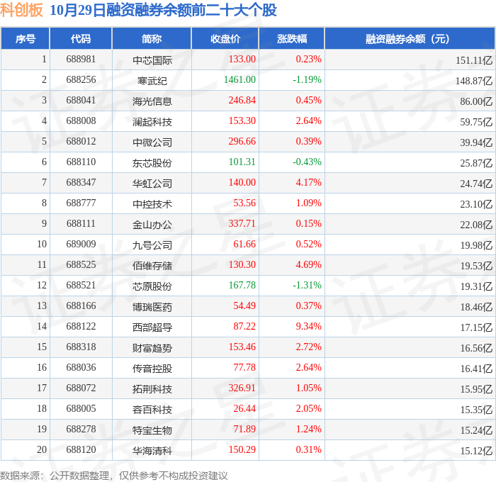 科创板融资融券余额前三分别为:中芯国际(688981)融资融券余额151.11亿元、寒武纪(688256)融资融券余额148.87亿元、海光信息(688041)融资融券余额86亿元,前20具体见下表: