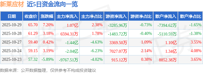 证券之星消息,截至2025年10月29日收盘,新莱应材(300260)报收于65.7元,上涨7.2%,换手率24.52%,成交量70.53万手,成交额44.79亿元。
