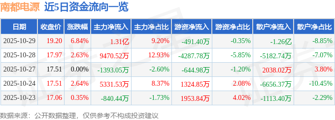 证券之星消息,截至2025年10月29日收盘,南都电源(300068)报收于19.2元,上涨6.84%,换手率8.94%,成交量76.26万手,成交额14.24亿元。