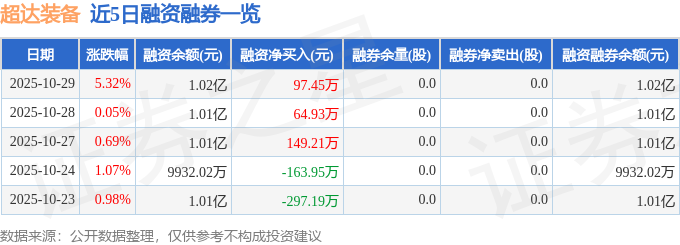 超达装备融资融券信息显示,融资方面,当日融资买入1972.97万元,融资偿还1875.52万元,融资净买入97.45万元,连续3日净买入累计311.59万元。融券方面,融券卖出0.0股,融券偿还0.0股,融券余量0.0股,融券余额0.0万元。融资融券余额1.02亿元。