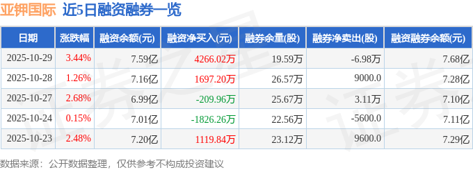 亚钾国际融资融券信息显示,融资方面,当日融资买入7859.48万元,融资偿还3593.46万元,融资净买入4266.02万元。融券方面,融券卖出500.0股,融券偿还7.03万股,融券余量19.59万股,融券余额864.9万元。融资融券余额7.68亿元。