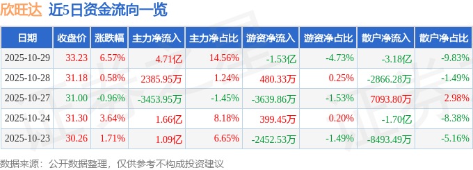 10月29日的资金流向数据方面,主力资金净流入4.71亿元,占总成交额14.56%,游资资金净流出1.53亿元,占总成交额4.73%,散户资金净流出3.18亿元,占总成交额9.83%。