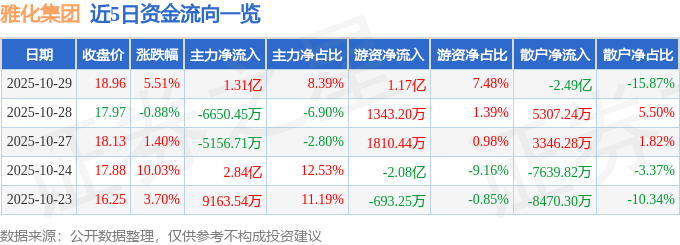 证券之星消息,截至2025年10月29日收盘,雅化集团(002497)报收于18.96元,上涨5.51%,换手率7.99%,成交量84.63万手,成交额15.66亿元。