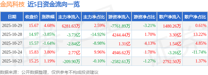 证券之星消息,截至2025年10月29日收盘,金风科技(002202)报收于15.67元,上涨4.68%,换手率4.68%,成交量156.99万手,成交额24.21亿元。
