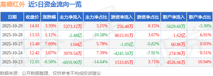 证券之星消息,截至2025年10月29日收盘,高德红外(002414)报收于14.01元,上涨3.39%,换手率3.6%,成交量122.36万手,成交额17.05亿元。