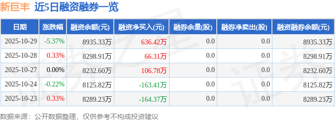 新巨丰融资融券信息显示,融资方面,当日融资买入1305.6万元,融资偿还669.18万元,融资净买入636.42万元,连续3日净买入累计809.51万元。融券方面,融券卖出0.0股,融券偿还0.0股,融券余量0.0股,融券余额0.0万元。融资融券余额8935.33万元。