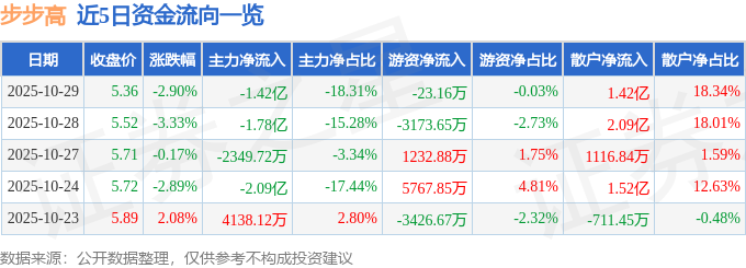 证券之星消息,截至2025年10月29日收盘,步步高(002251)报收于5.36元,下跌2.9%,换手率6.7%,成交量144.22万手,成交额7.75亿元。