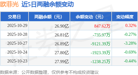 证券之星消息,10月29日,欧菲光(002456)融资买入8882.0万元,融资偿还7922.6万元,融资净买入959.4万元,融资余额26.83亿元。