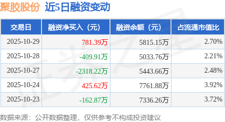 证券之星消息,10月29日,聚胶股份(301283)融资买入2219.43万元,融资偿还1438.04万元,融资净买入781.39万元,融资余额5815.15万元。