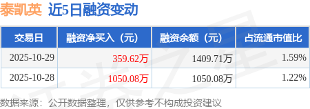 证券之星消息,10月29日,泰凯英(920020)融资买入1210.27万元,融资偿还850.64万元,融资净买入359.62万元,融资余额1409.71万元。
