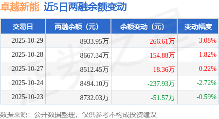证券之星消息,10月29日,卓越新能(688196)融资买入718.08万元,融资偿还451.47万元,融资净买入266.61万元,融资余额8933.95万元,近3个交易日已连续净买入累计439.85万元。