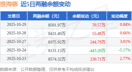 证券之星消息,10月29日,维海德(301318)融资买入751.84万元,融资偿还681.27万元,融资净买入70.57万元,融资余额8501.97万元,近3个交易日已连续净买入累计370.85万元。