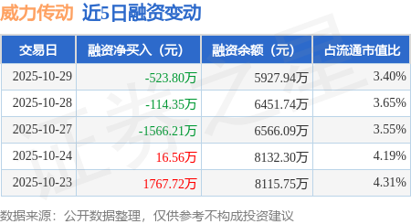 证券之星消息,10月29日,威力传动(300904)融资买入1165.89万元,融资偿还1689.7万元,融资净卖出523.8万元,融资余额5927.94万元,近20个交易日中有11个交易日出现融资净买入。