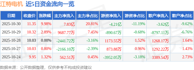 证券之星消息,江特电机10月30日涨停收盘,收盘价11.35元。该股于11点28分涨停,1次打开涨停,截止收盘封单资金为1.88亿元,占其流通市值0.97%。