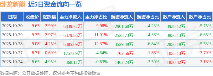 证券之星消息,截至2025年10月30日收盘,卧龙新能(600173)报收于9.63元,上涨2.99%,换手率10.21%,成交量71.5万手,成交额6.85亿元。