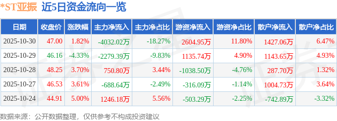 证券之星消息,截至2025年10月30日收盘,*ST亚振(603389)报收于47.0元,上涨1.82%,换手率1.8%,成交量4.73万手,成交额2.21亿元。