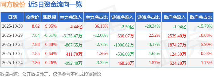 证券之星消息,同方股份10月30日涨停收盘,收盘价8.62元。该股于9点36分涨停,1次打开涨停,截止收盘封单资金为1.21亿元,占其流通市值0.42%。
