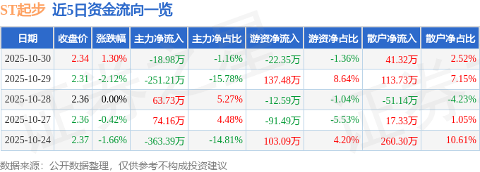 证券之星消息,截至2025年10月30日收盘,ST起步(603557)报收于2.34元,上涨1.3%,换手率1.13%,成交量7.02万手,成交额1640.18万元。