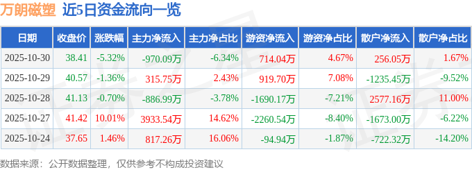 证券之星消息,截至2025年10月30日收盘,万朗磁塑(603150)报收于38.41元,下跌5.32%,换手率4.57%,成交量3.91万手,成交额1.53亿元。