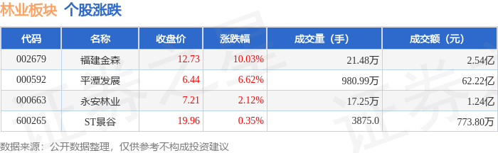 证券之星消息,10月30日林业板块较上一交易日上涨5.75%,福建金森领涨。当日上证指数报收于3986.9,下跌0.73%。深证成指报收于13532.13,下跌1.16%。林业板块个股涨跌见下表: