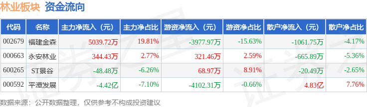 从资金流向上来看,当日林业板块主力资金净流出3.88亿元,游资资金净流出7689.85万元,散户资金净流入4.65亿元。林业板块个股资金流向见下表: