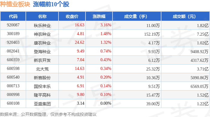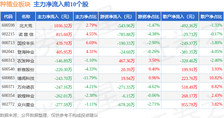 从资金流向上来看,当日种植业板块主力资金净流出1.26亿元,游资资金净流出2474.62万元,散户资金净流入1.51亿元。种植业板块个股资金流向见下表:
