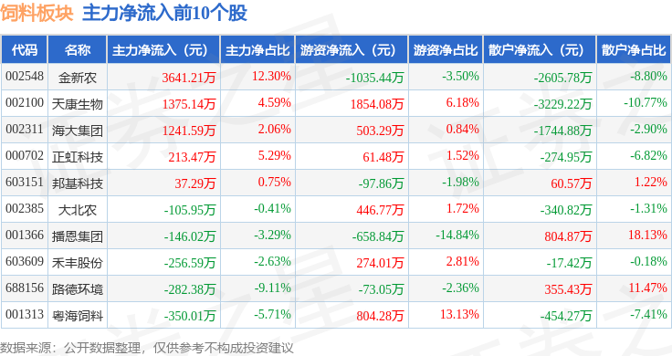 从资金流向上来看,当日饲料板块主力资金净流出714.5万元,游资资金净流入3427.8万元,散户资金净流出2713.3万元。饲料板块个股资金流向见下表: