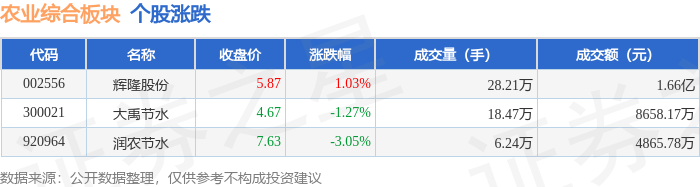 证券之星消息,10月30日农业综合板块较上一交易日上涨0.05%,辉隆股份领涨。当日上证指数报收于3986.9,下跌0.73%。深证成指报收于13532.13,下跌1.16%。农业综合板块个股涨跌见下表: