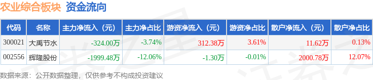 从资金流向上来看,当日农业综合板块主力资金净流出2323.49万元,游资资金净流入311.08万元,散户资金净流入2012.4万元。农业综合板块个股资金流向见下表:
