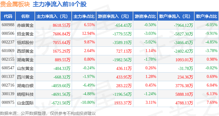 从资金流向上来看,当日贵金属板块主力资金净流出1.74亿元,游资资金净流入1.93亿元,散户资金净流出1848.73万元。贵金属板块个股资金流向见下表: