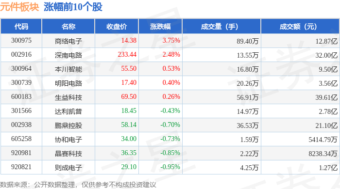证券之星消息,10月30日元件板块较上一交易日下跌2.57%,南亚新材领跌。当日上证指数报收于3986.9,下跌0.73%。深证成指报收于13532.13,下跌1.16%。元件板块个股涨跌见下表:
