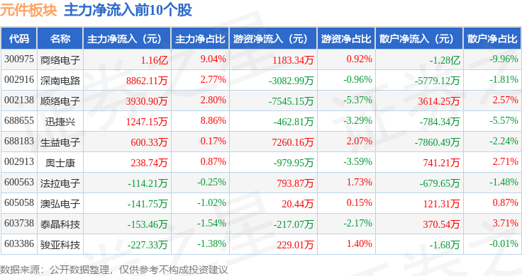 从资金流向上来看,当日元件板块主力资金净流出52.44亿元,游资资金净流入13.23亿元,散户资金净流入39.21亿元。元件板块个股资金流向见下表:
