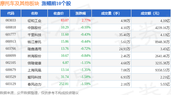 证券之星消息,10月30日摩托车及其他板块较上一交易日下跌1.25%,久祺股份领跌。当日上证指数报收于3986.9,下跌0.73%。深证成指报收于13532.13,下跌1.16%。摩托车及其他板块个股涨跌见下表: