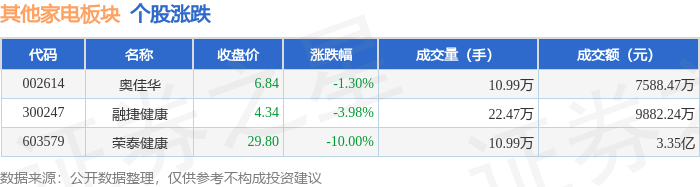 证券之星消息,10月30日其他家电板块较上一交易日下跌6.39%,荣泰健康领跌。当日上证指数报收于3986.9,下跌0.73%。深证成指报收于13532.13,下跌1.16%。其他家电板块个股涨跌见下表: