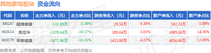 从资金流向上来看,当日其他家电板块主力资金净流出7382.38万元,游资资金净流入1734.4万元,散户资金净流入5647.98万元。其他家电板块个股资金流向见下表: