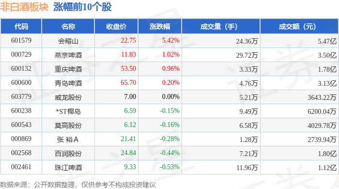 证券之星消息,10月30日非白酒板块较上一交易日上涨0.32%,会稽山领涨。当日上证指数报收于3986.9,下跌0.73%。深证成指报收于13532.13,下跌1.16%。非白酒板块个股涨跌见下表: