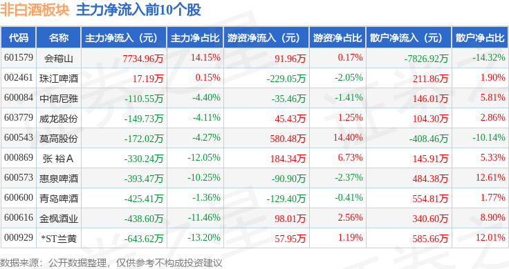 从资金流向上来看,当日非白酒板块主力资金净流出4791.59万元,游资资金净流入3952.4万元,散户资金净流入839.19万元。非白酒板块个股资金流向见下表: